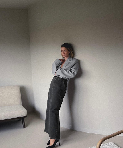 Na een casual maandag kunnen we op dinsdag weer even wat heel anders uit de kast trekken. Een lange spijkerrok is helemaal hot en de combinatie met pumps en een blazer zoals Rianne dit doet maakt de outfit stoer en chique tegelijk.