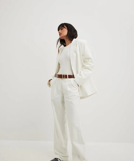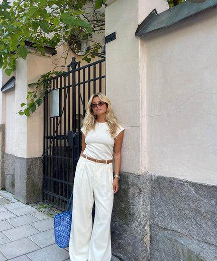 On Wednesdays we wear... white! Deze look van Matilda Djerf is simpel maar classy en perfect voor een werkdag. Het bruine ceintuur maakt de outfit helemaal af maar je kunt natuurlijk ook voor een andere kleur gaan.