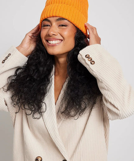 Deze fel oranje beanie is perfect om een zwarte outfit af te maken en ook juist heel goed te combineren met beige- en bruintinten.