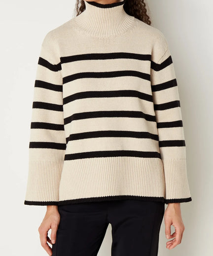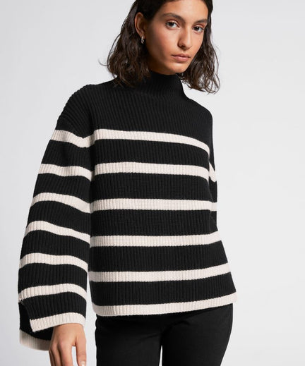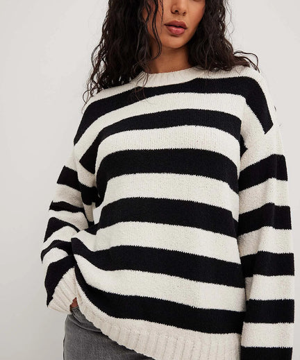 Deze oversized trui is gebreid met een ronde hoge halslijn. Mocht je toch geen fan zijn van de gestreepte variant, is deze trui er ook in het gebroken wit.