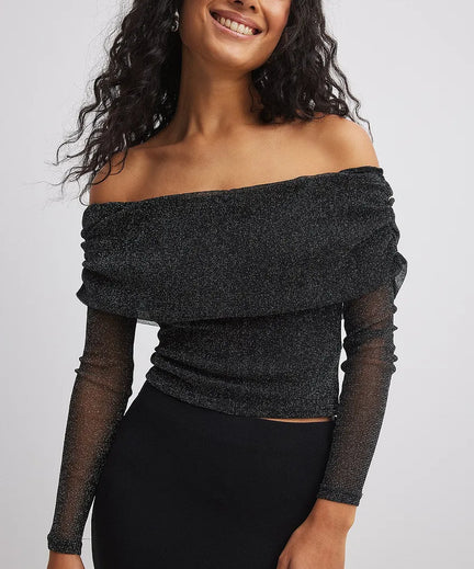 Glitters + mesh + off-shoulder = de party top van jouw dromen. Maak je outfit af met een zwarte pantalon en een paar hakken of - gewoon comfortabel - een mooi paar sneakers.