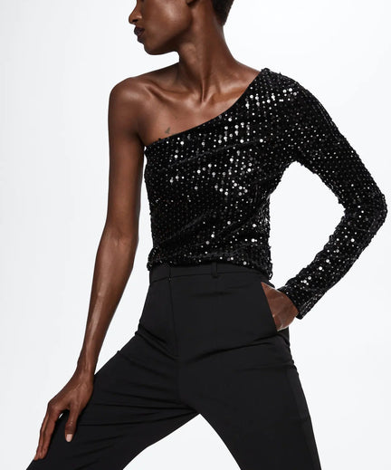 Voor wie toch liever niet voor een panty gaat (koud!), is een opvallend shirt met daaronder een mooie pantalon de perfecte oplossing. Wat dacht je van deze one-sleeve? De pailletten zorgen ervoor dat je er helemaal ready to party uitziet.