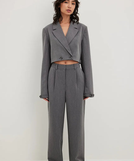 Er zijn heel wat variaties op blazers en we zien ook steeds vaker de cropped variant. Deze in het grijs draag je samen met de bijbehorende broek voor de perfecte outfit.