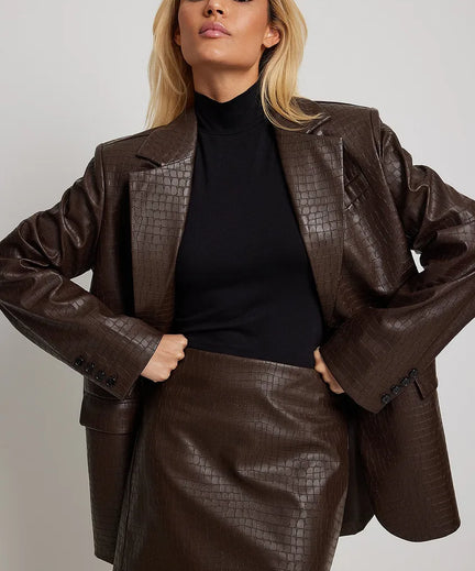 Bruin is de kleur van het moment en in combinatie met de reptile look is deze blazer geweldig. Mocht je toch liever voor zwart gaan dan is deze optie er ook.