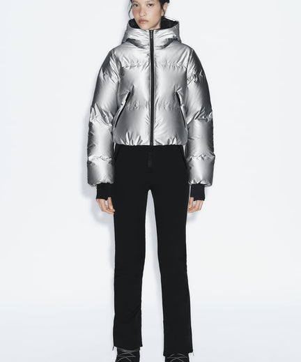 De zilveren pufferjas en de zilveren broek hebben we de afgelopen maanden vaak voorbij zien komen. Een goeie zet dus van Zara om ook een ski jas te ontwerpen in het zilver. Met deze eyecatcher steel jij, ongeacht je ski-skills, hoe dan ook de show. De jas bestaat voor 85% uit dons en voor 15% uit veertjes waardoor je met hele lage temperaturen lekker warm blijft.