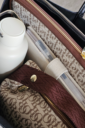 • is verkrijgbaar in onze iconische jacquard print met vegan leather en gouden details