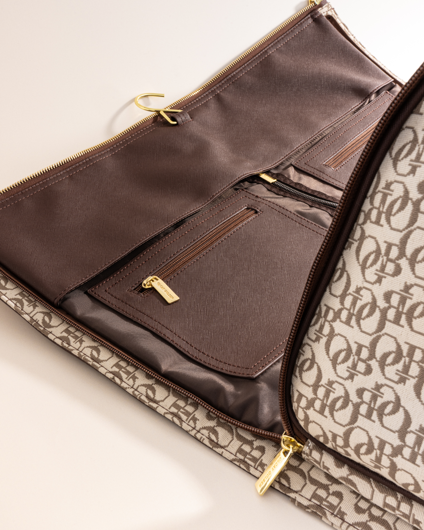 Gebruik 'm als ruime weekendtas of rits hem open tot een full-length kledinghoes. De rijke chocoladebruine details en luxe gouden ritsen zorgen voor een extra touch of glam, waar je ook naartoe gaat.