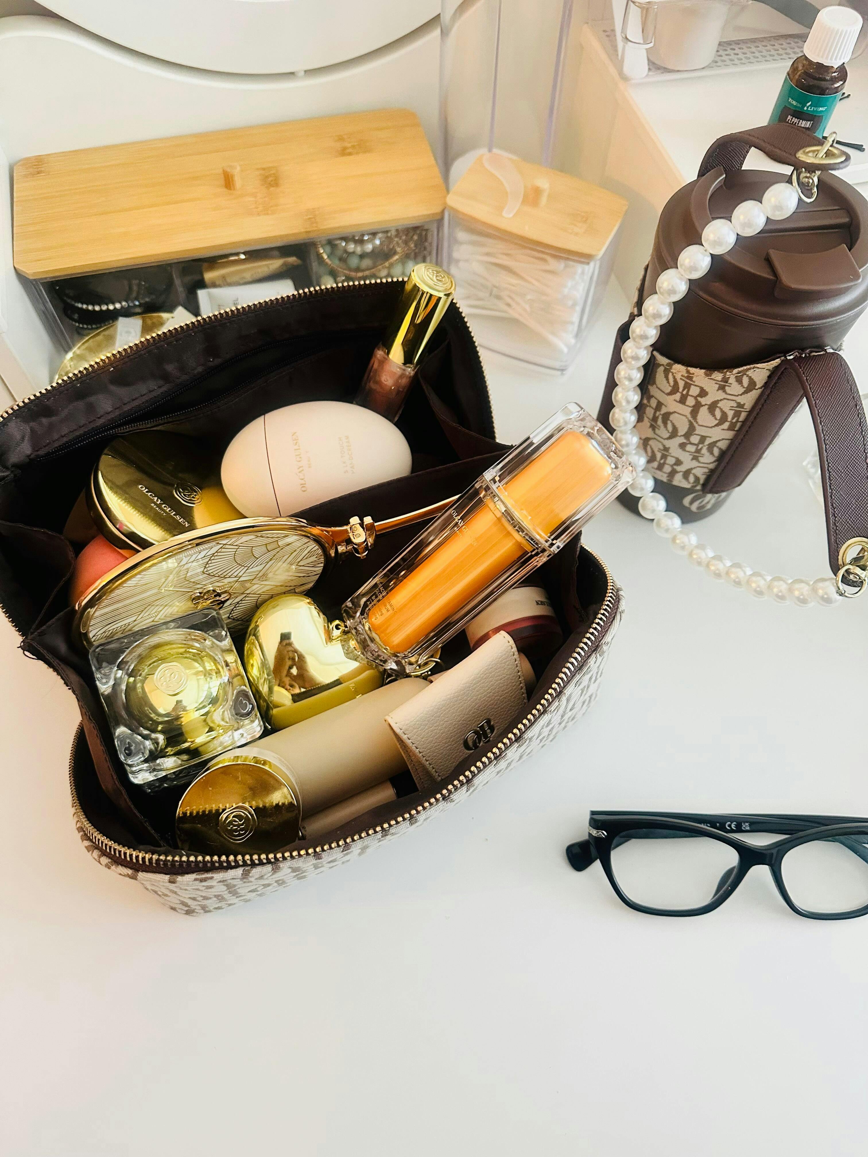 Met de Olcay Gulsen Beauty Small Jacquard Makeup Bag houd je jouw dagelijkse beauty essentials altijd stijlvol binnen handbereik. Deze compacte make-up pouch is uitgevoerd in onze signature jacquard print en afgewerkt met een diagonale, gouden rits voor een luxe uitstraling. Het faux leather hengsel zorgt ervoor dat je deze travel friendly beauty bag overal mee naartoe neemt.