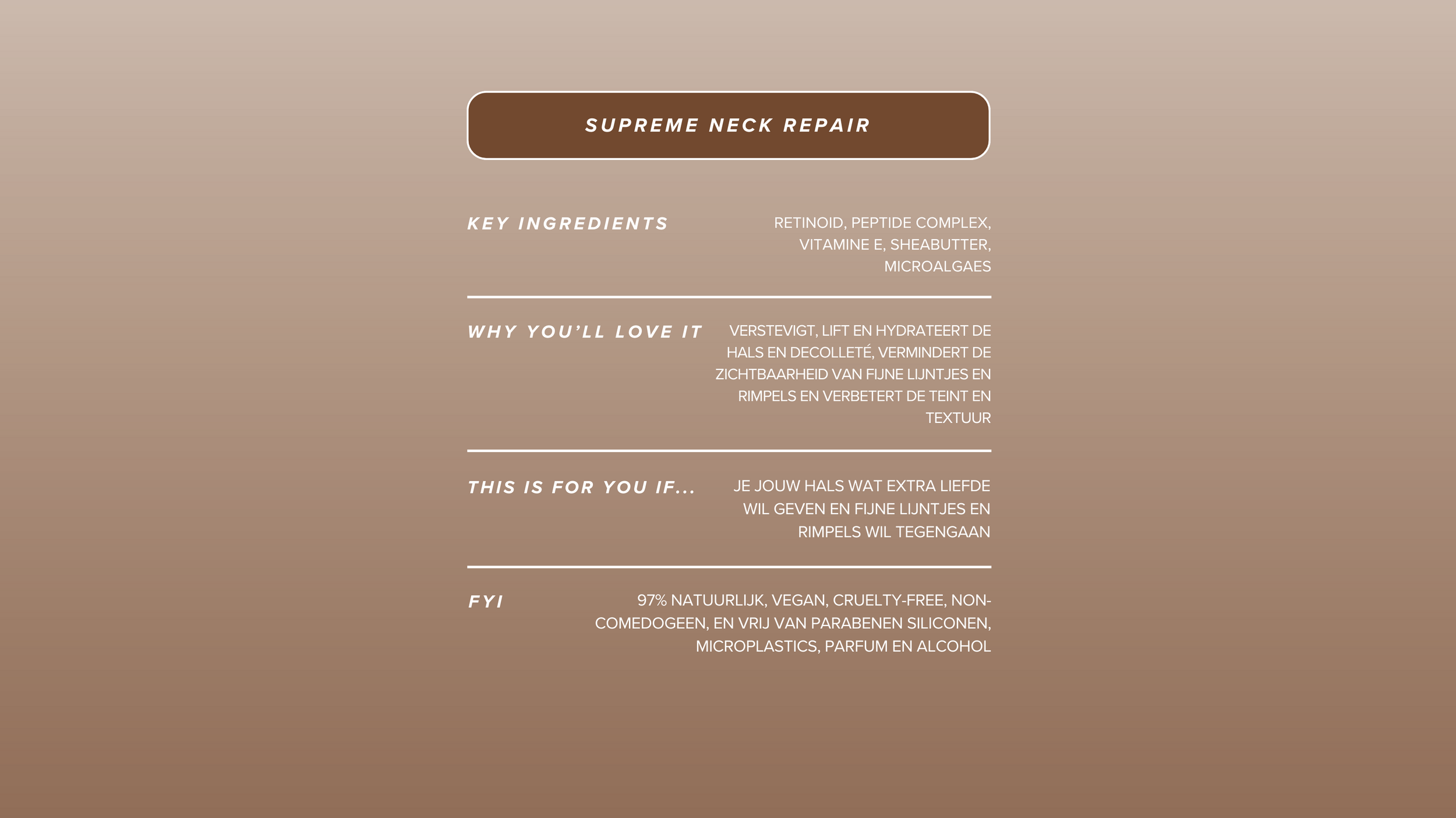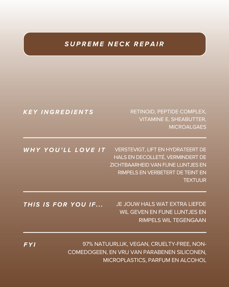 De rijke, voedende formule trekt snel in, waardoor je nek en decolleté zijdezacht, glad en intens gehydrateerd aanvoelen. Zeg voorgoed vaarwel tegen een verwaarloosde hals: dit is jouw go to product voor nek- en decolleté verzorging.