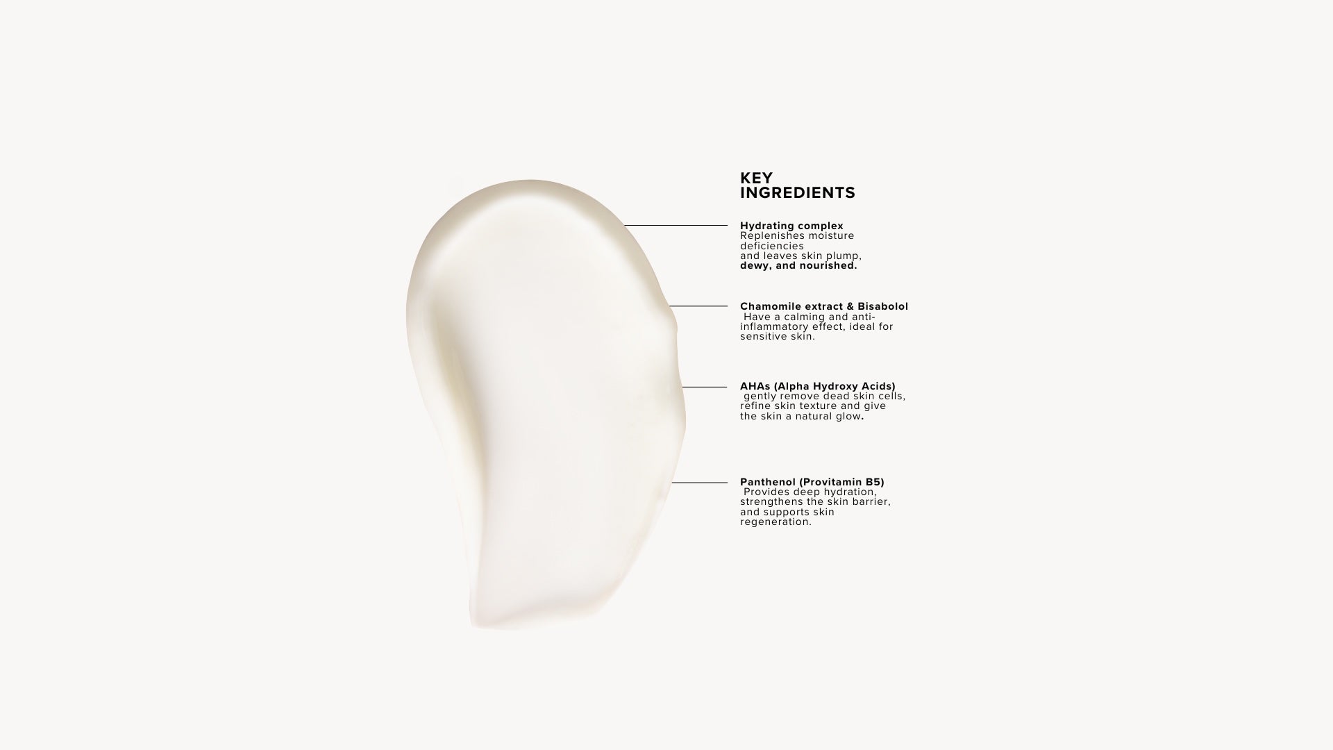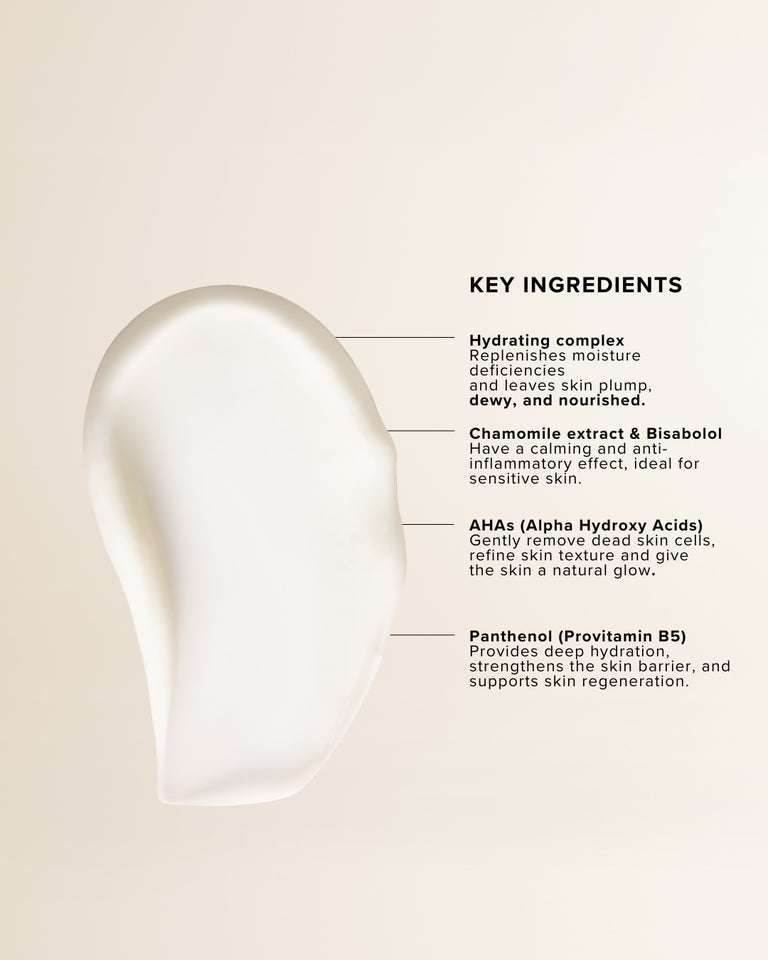 Het intens hydraterende complex vult vochttekorten aan en laat de huid plump, dewy en comfortabel aanvoelen. Kamille-extract en bisabolol kalmeren de huid en helpen roodheid te verminderen, terwijl panthenol diep hydrateert en de huidbarrière ondersteunt. Dankzij deze verzorgende balans is het masker ook geschikt voor de gevoelige huid. De zachte crème textuur maakt elk gebruik een luxe selfcare moment.