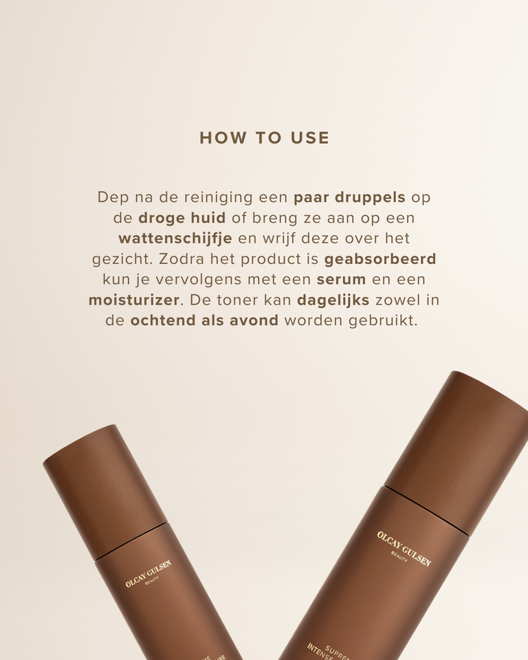 De Olcay Gulsen Beauty Supreme Intense Moisture Toner is jouw ultieme skincare upgrade: een zachte, hydraterende toner die je huid voedt, kalmeert en laat stralen. Deze toner voor droge huid is perfect als verfrissende tussenstap in je huidverzorgingsroutine, zowel ‘s ochtends als ‘s avonds. Het is een glow booster die jouw huid voorbereidt op de rest van je routine.
