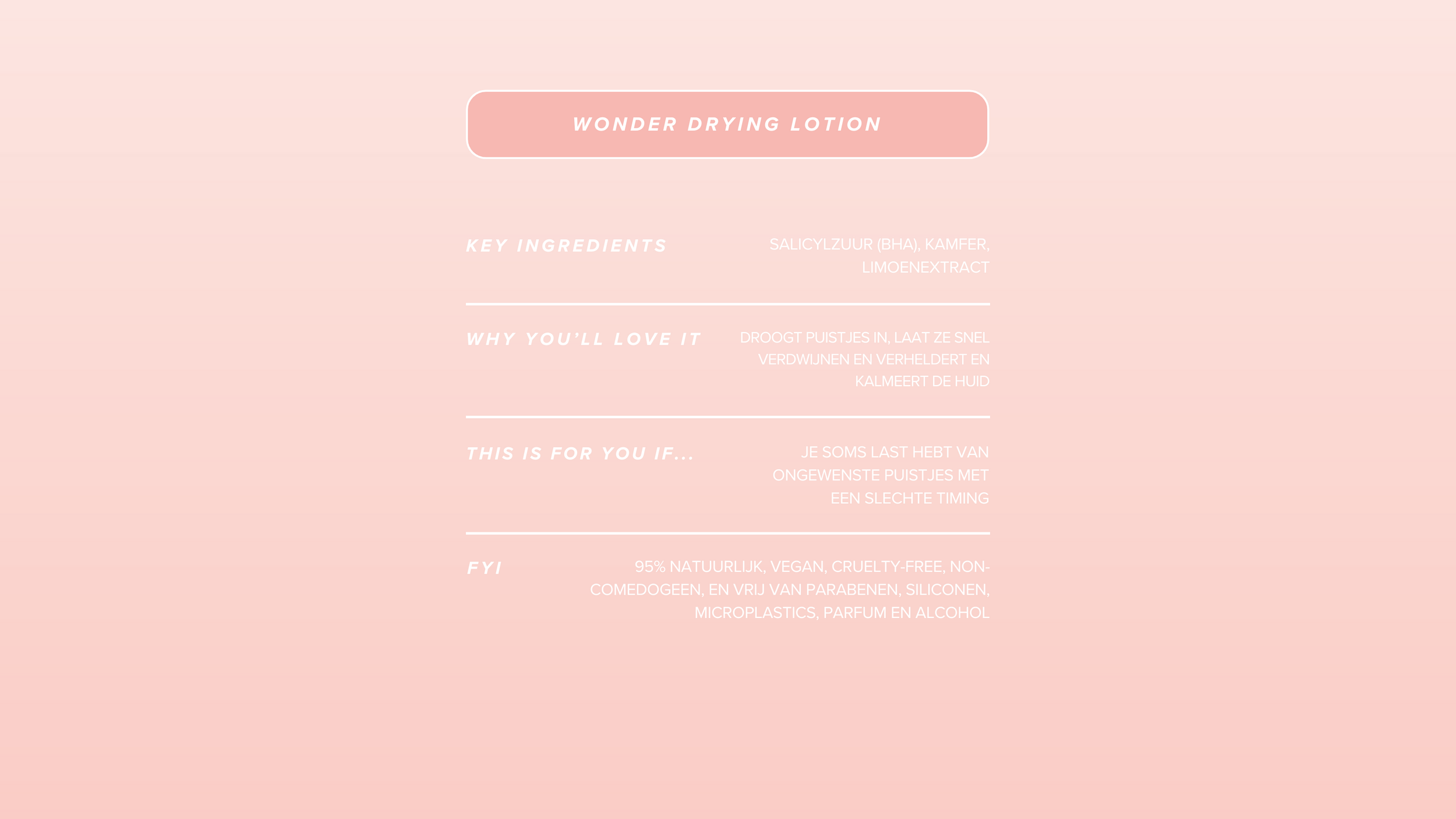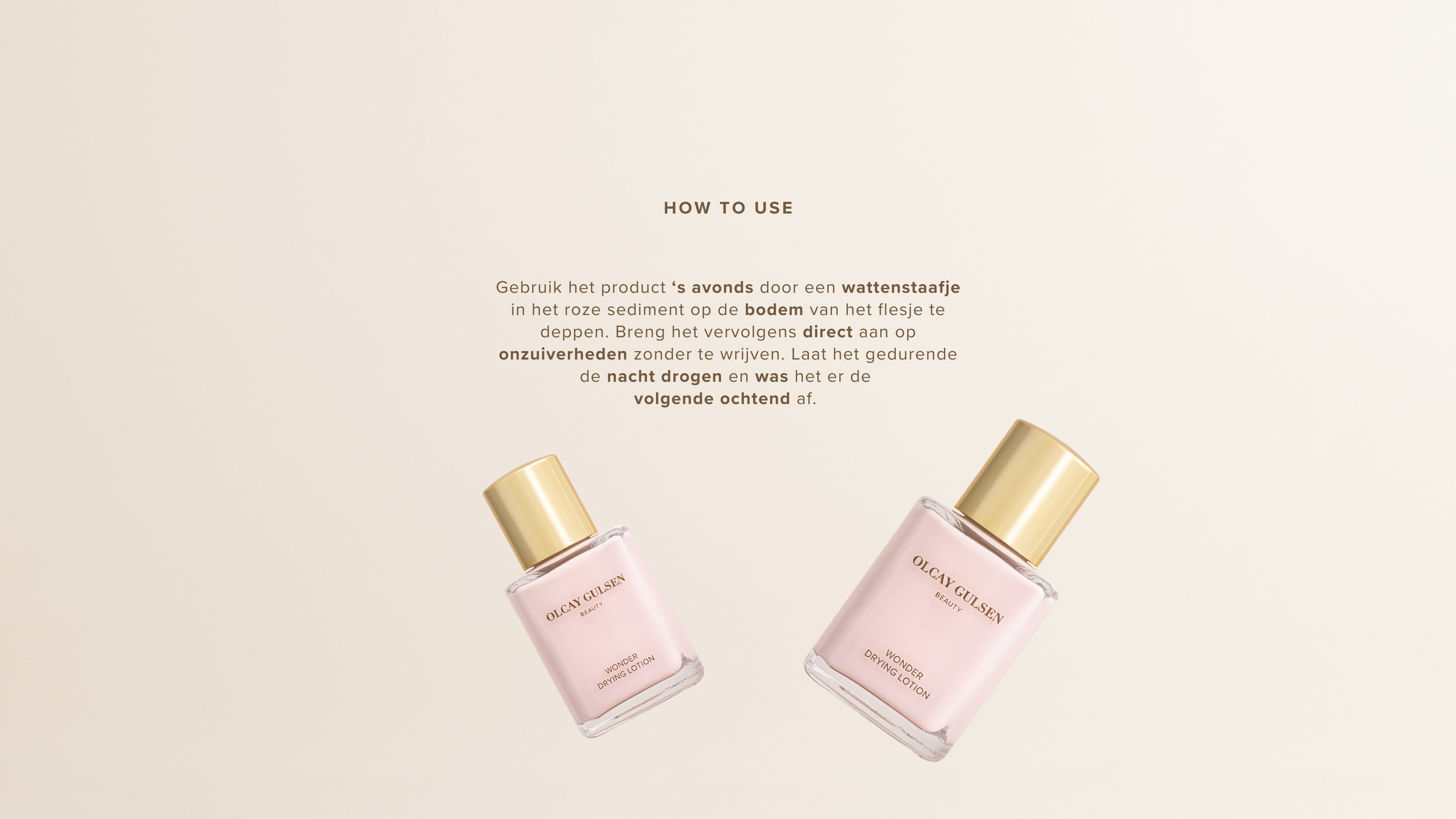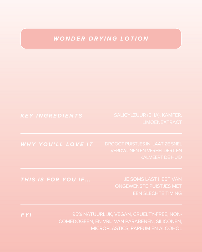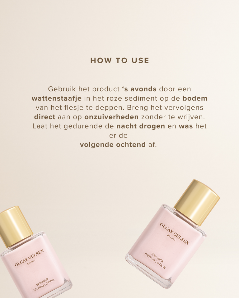 Gebruik, na het aanbrengen van je avond skincare routine, een wattenstaafje (met een reiniger of water) om het gebied van het puistje dat je aan wilt stippen schoon te maken. Gebruik de andere kant van het wattenstaafje om de Drying Lotion vervolgens aan te brengen. Op deze manier weet je zeker dat je het product op de juiste plek aanbrengt en hoef je er niet omheen te werken.