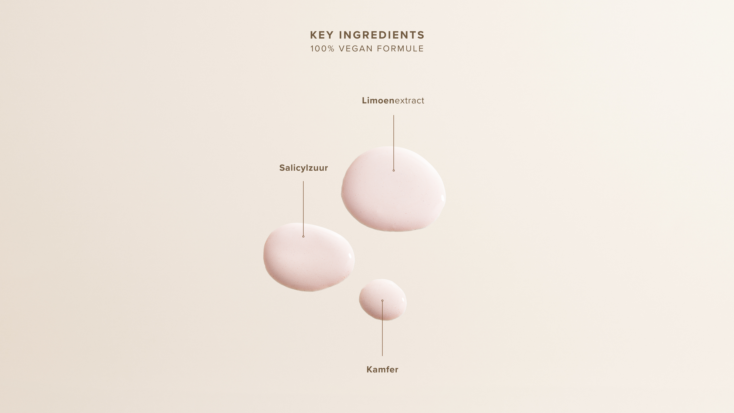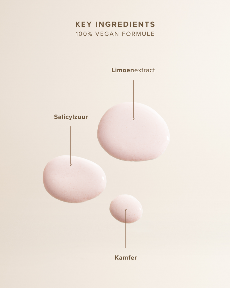De lotion bevat salicylzuur, dat diep in de poriën dringt om overtollig talg en vuil te verwijderen. Daarnaast helpt kamfer om irritatie en roodheid te verminderen, terwijl limoenextract de huid verheldert en egaliseert. Hierdoor droogt het puistjes effectief uit en versnelt het het herstelproces.