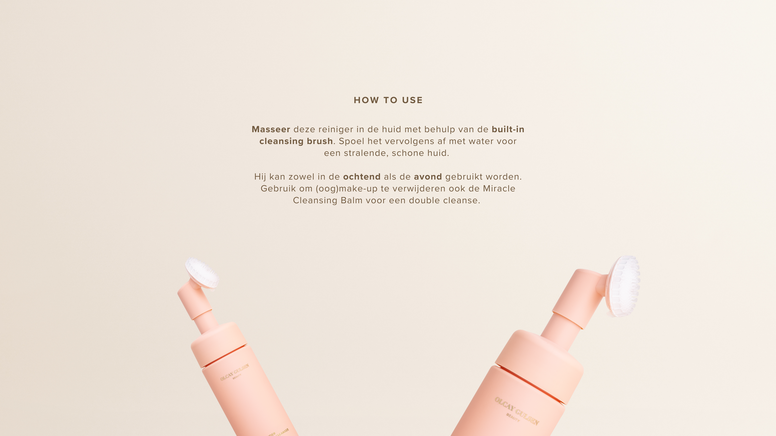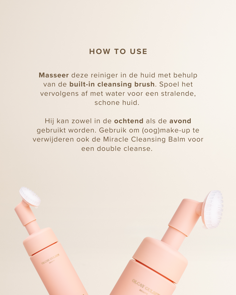 Druk op de pomp zodat het zachte schuim tevoorschijn komt en masseer dit met behulp van de built-in cleansing brush in op de huid met ronddraaiende bewegingen. We adviseren minimaal een minuut te reinigen, om het vervolgens af te spoelen met water. Deze cleanser kan zowel in de ochtend als avond gebruikt worden. Deze reiniger is niet geschikt voor het verwijderen van oogmake-up. Wanneer het product met de ogen in contact komt, spoel dit dan direct goed uit.