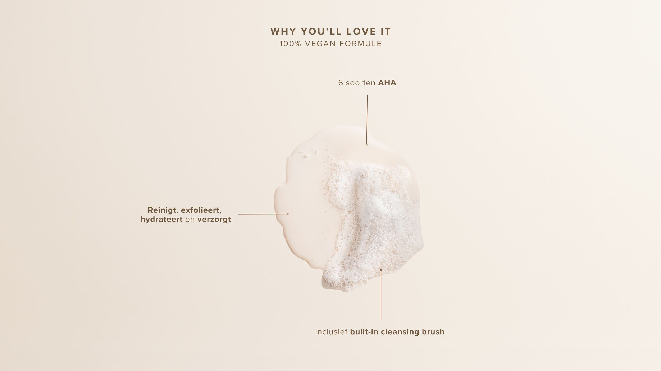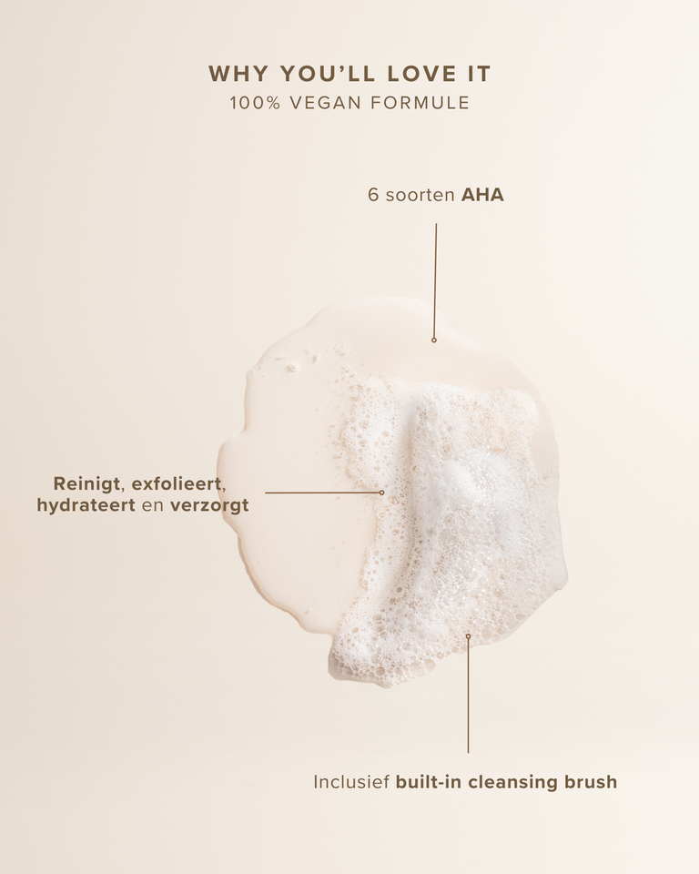 Deze cleanser heeft een unieke lotion-to-foam formule die niet alleen reinigt, maar ook mild exfolieert dankzij 6 verschillende AHA’s. Daarnaast heeft het een ingebouwde cleansing brush voor een diepere, maar zachte reiniging.